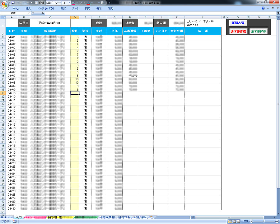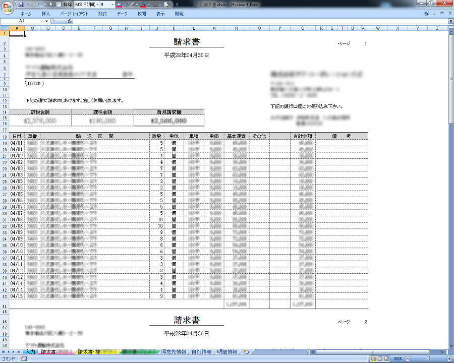 - 上記「3」を運航日分行った後「請求書作成」ボタンをクリックすると、請求書と請求書控えが別のシートに作成される。請求書の内容が正しいことを確認したら、Excelの印刷機能で請求書を印刷する。