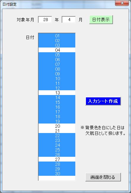- Excelのフォームで、対象月度の日付の一覧のうち、欠航日を指定する。